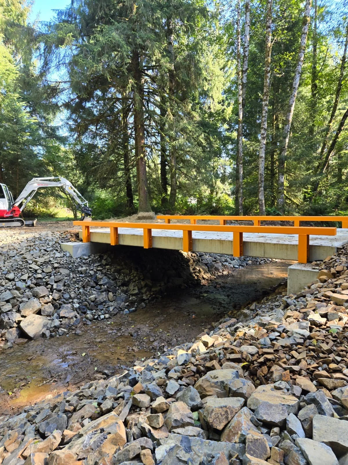 Replacement of a 7' culvert that is undersized for the stream bankfull width of 13' and placement of a bridge that meets the Oregon Department of Fish and Wildlife fish passage criteria. Riparian planting and large woody debris structure placement will be added to improve fish habitat.